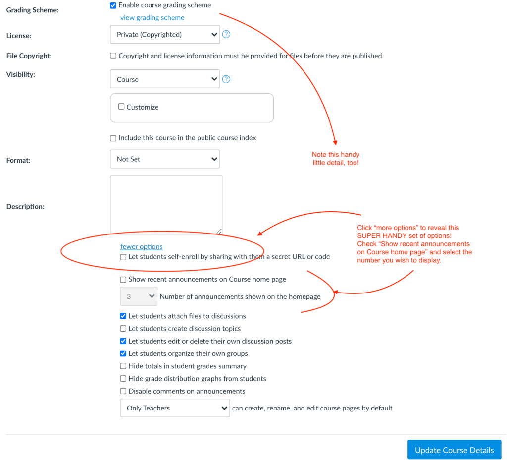 Canvas defaults to keeping Announcements in a separate space, accessible from the course navigation pane. It is also, at this point in time, not the easiest thing to change that! To add Announcements to your home page, go to Settings/Course Details in your Canvas page. Scroll to the bottom, and click “more options.”