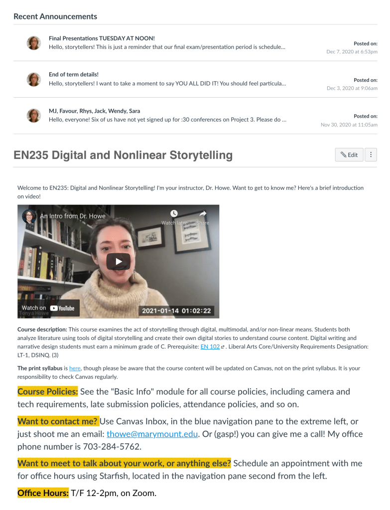 What do you want your students to see upon logging into your course? You need to think about this, and carefully. Do you want them to know what the readings and assignments are per the syllabus? Consider using a modules list for your home page. Do you want students to have clear access to, say, a course description and office hours information, without clicking into anything? Consider a static home page. According to a presentation for MICA’s Data Analytics and Visualization statistics course by Lauren Fox, a consultant for Instructure, there are correlations between homepage setup and and student engagement (Fox 2021).