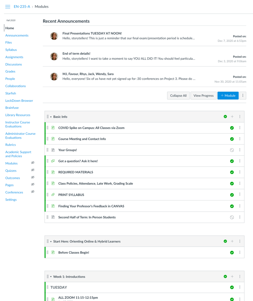 Whether you use Modules or a static Page, you should put your Announcements on the home page. There is a very high positive correlation between using announcements and student submission of assignments (Fox 2021).