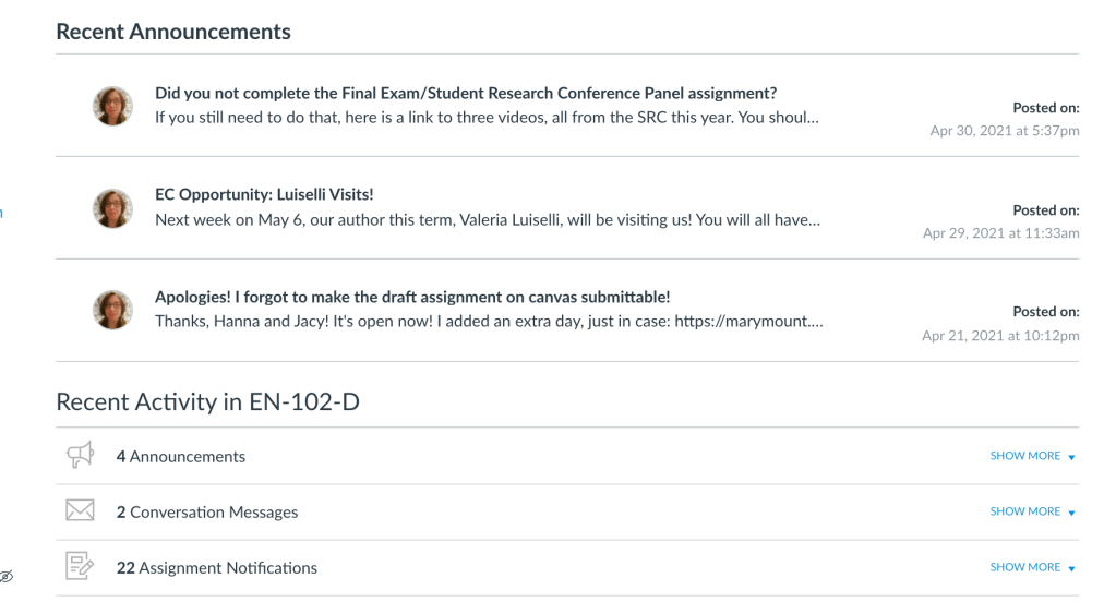 Orienting students to Canvas with thoughtful, useful homepage is a very good idea. Canvas does not default to this, however; it defaults to the “Course Activity Stream.” As you can see, this is pretty bare-bones, and can lead to lack of clarity. A strong negative correlation between student activity and home pages set to the default Course Activity Stream (Fox 2021) means that leaving things as they default is not helpful for students.