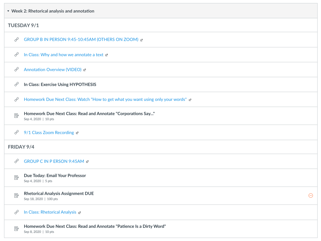 When I first started using Canvas on the regular, I was not sold on modules–I basically had a static home page composed of my syllabus and schedule as the front page. Then, I linked to each assignment that had to be submitted. This worked generally well, but I am now thinking of course reuse and student experience and have found that week-by-week modules with daily schedules work even better.