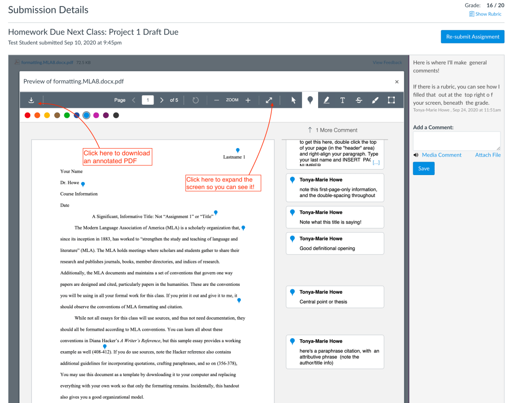 And from here, it’s not easy to see the feedback, either. Students still need to click to expand the window–most students are on laptops with small screens or mobile devices, and find it very difficult to read on Canvas. The other option is to download the annotated document so it can be viewed as a PDF.