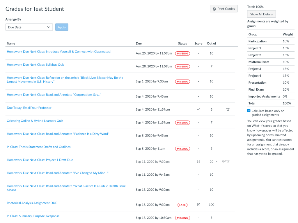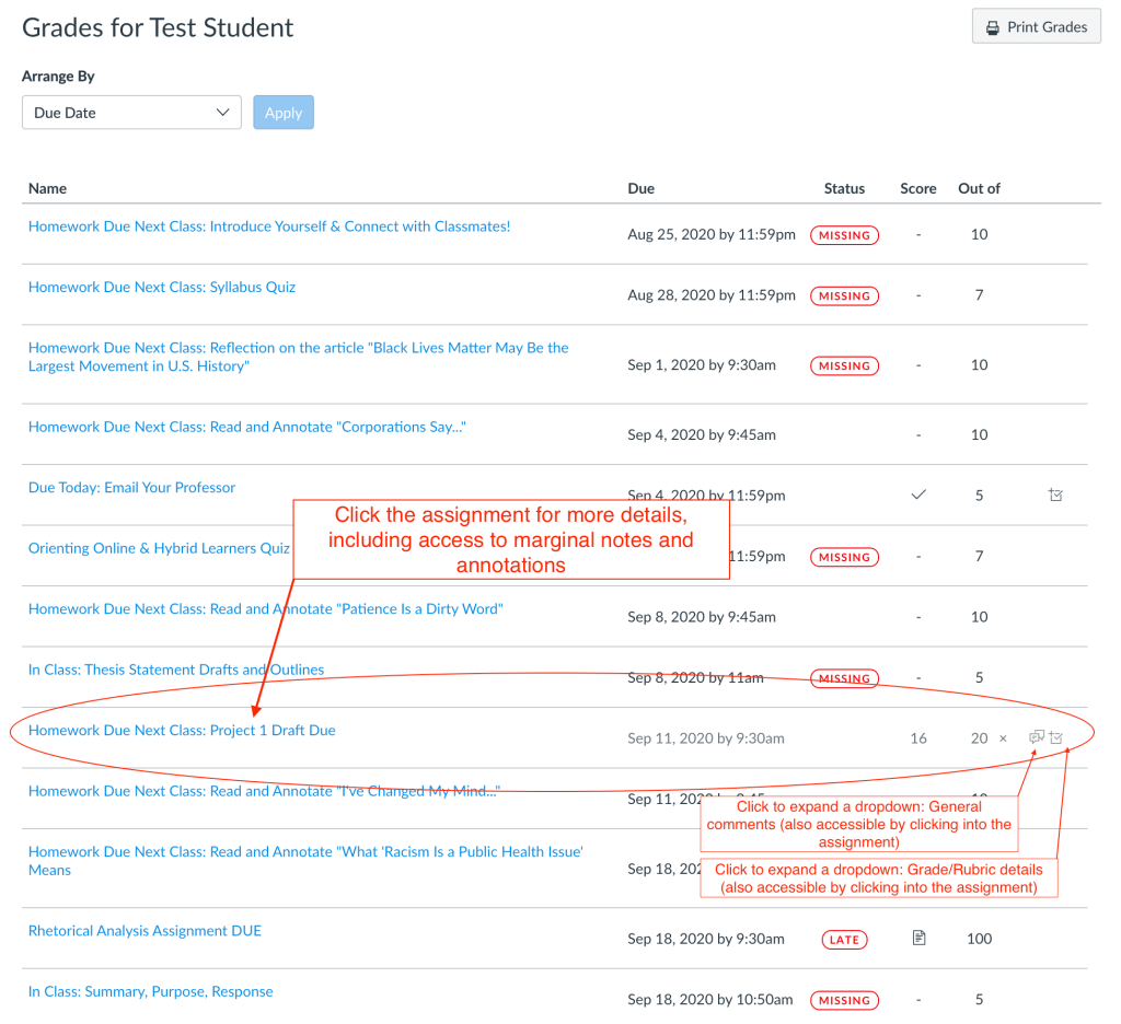 A couple things to note here–the grades are automatically listed by assignment by due date. Students can toggle the view in various ways. How do you see feedback? Canvas clearly emphasizes the final score, rather than the feedback process. Students can see their score out of total points, and then there is an unlabled column on the right with some icons.