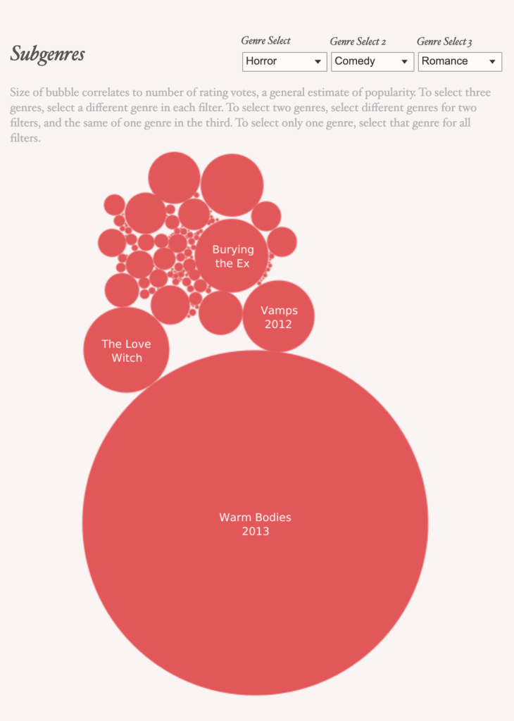 I also experimented with the title AKA file, which contained region information, but this information was associated with particular titles, rather than the original film itself (for instance, I wanted to show a map of where the most horror films or horror subgenres were made; the title AKAs file connects region info only to the specific iteration of the title name—a title version assigned in Canada, in Thailand, and so on. The “original title” and “ordering” fields were not helpful for filtering, weirdly. I further tried to bring in multiple files, particularly those dealing with the principal people involved in the title and the names file to identify them. However, this proved very complicated—each name was associated with up to 4 titles, and I could not figure out how to use the relationships or noodles to make that work in any meaningful way. I may set up an appointment with you to try to figure that out! I had problems with text formatting in Public, and I removed the timeline page interaction because Public was not representing it as I wanted.