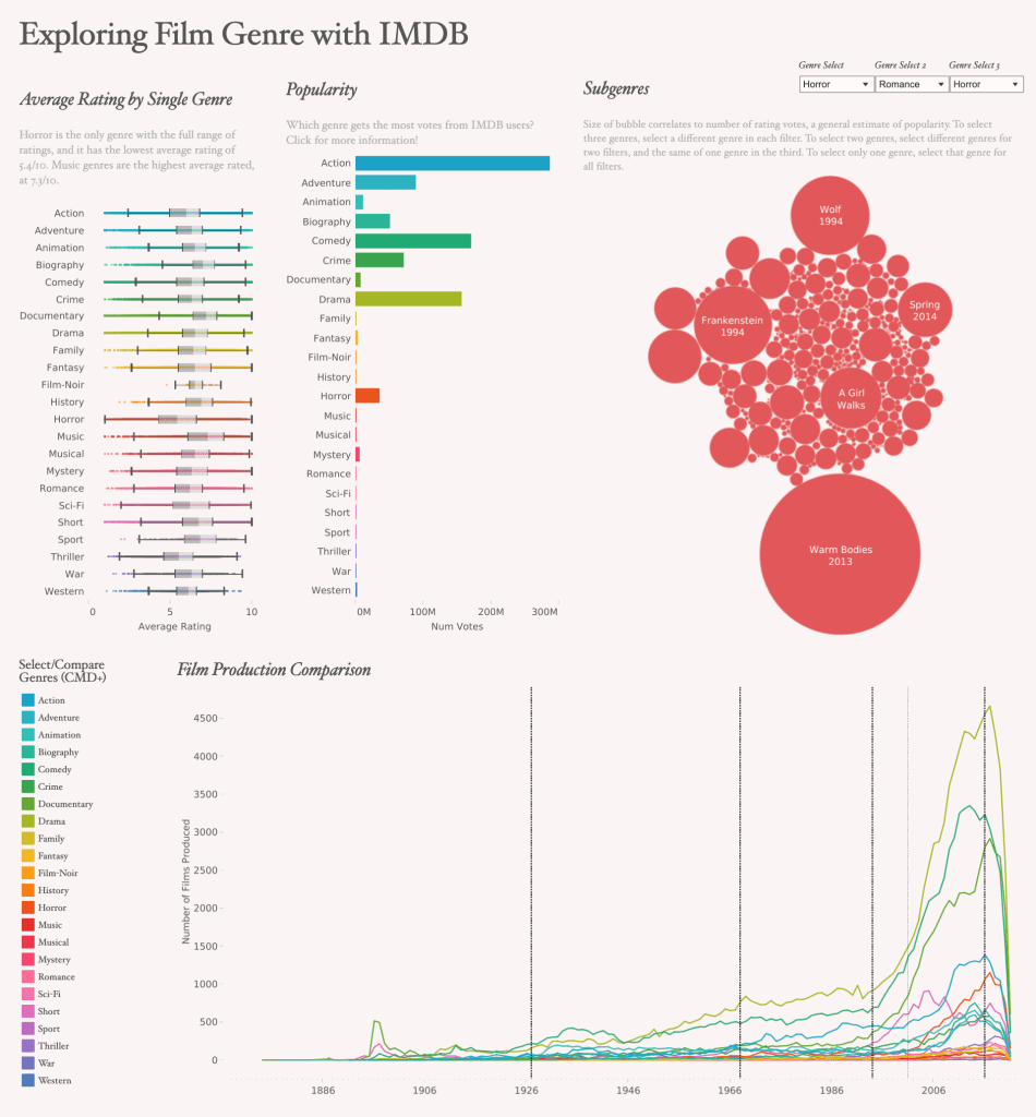 I built a visualization with minimal interaction (outside of tooltips), because the data fields were slightly different between some of the visualizations and I didn’t want things to get confusing. I created two boxplot charts for ratings by genre and number of votes by genre, drawing on the first genre split field, to get a general sense of how people felt about and interacted with the IMDB titles. IMDB data is all user-generated. Then, I added a bubble chart with selectors for genres. These genre selectors are based on calculations to compare a selected genre with the genres array field in the original data, so it is more robust than the individual splits themselves. I tried to create a concatenated genres parameter, but it didn’t quite work as expected, and after reaching out online, via slack, and to the professor, I decided my workaround was good enough for the time being. Currently, if users want to see films that were assigned three different genres, that’s straightforward. But, if users want to see only films of one genre (or two), the genres need to be duplicated, because there is no “none” feature. Then, I created a timeline to show film production by genre over time, with reference lines for key historical/cultural moments (the beginning of the sound era, the end of the Hays Code, the beginning of the 24-hour news cycle, 9/11 attacks, and the era of Trump/Covid (lumped together principally for readability). Users can command-select to highlight multiple genres, which also highlights the ratings and number of vote information for those genres; or, users can keep [them] only to see comparisons without the other marks. I was interested in genres, subgenres, and the relationships between genres and contextual factors (like ratings, voting habits, and history).