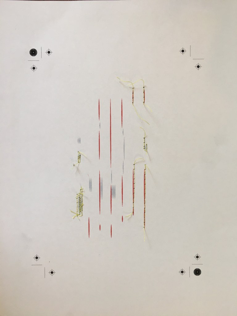 Using the sewing machine, however, proved more challenging than I’d expected, because the thread was old, the stitches not tight (because they’re going into paper, and very short), the paper deliccate, and the template paper a lot tougher than I thought possible! Here’s my attempt at a draft using the machine….
