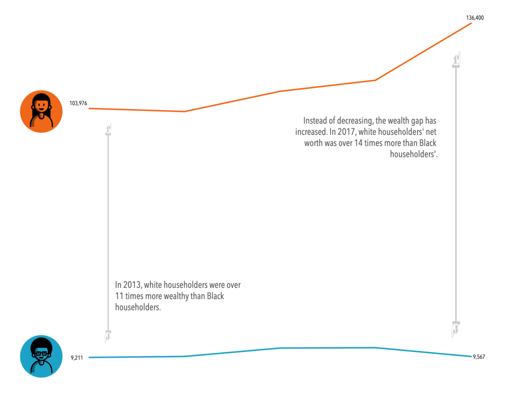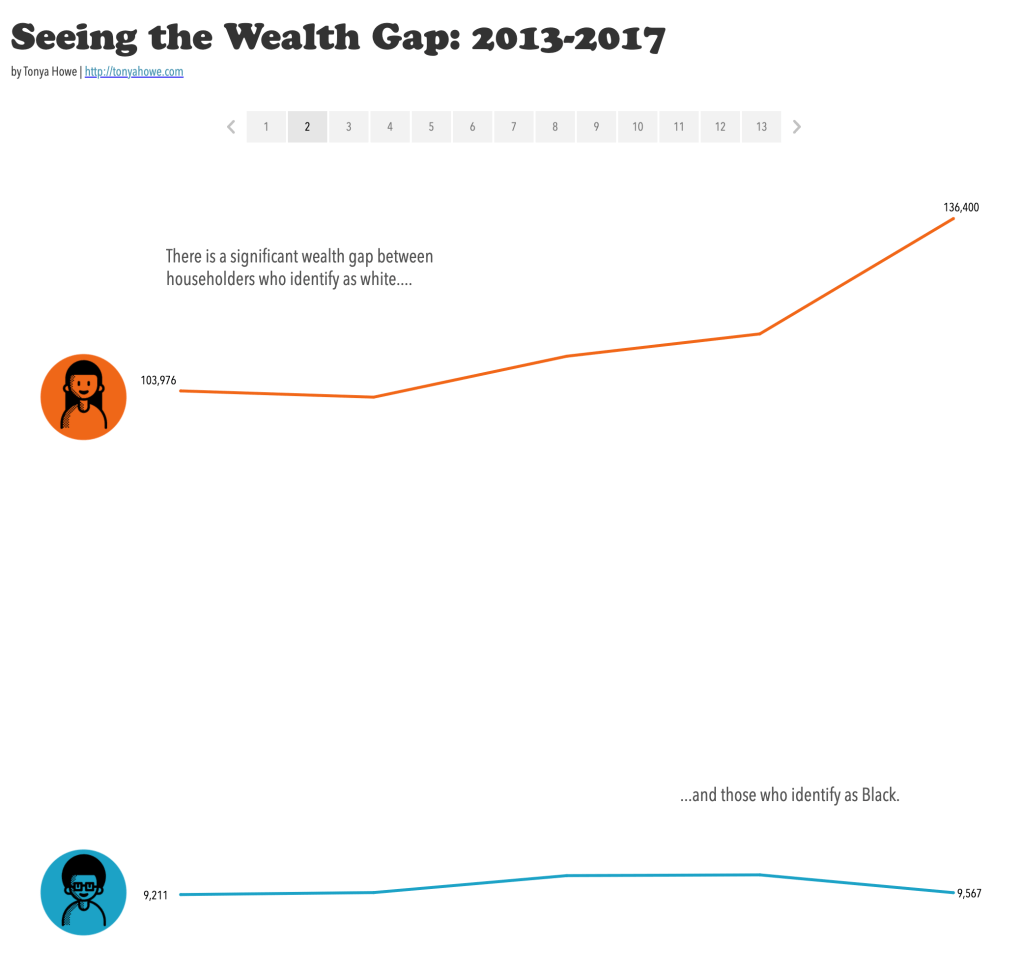 The reader should click through the story page by page to learn more. I was astonished to see the increase in white wealth as opposed bo Black wealth even over a small 5-year period.