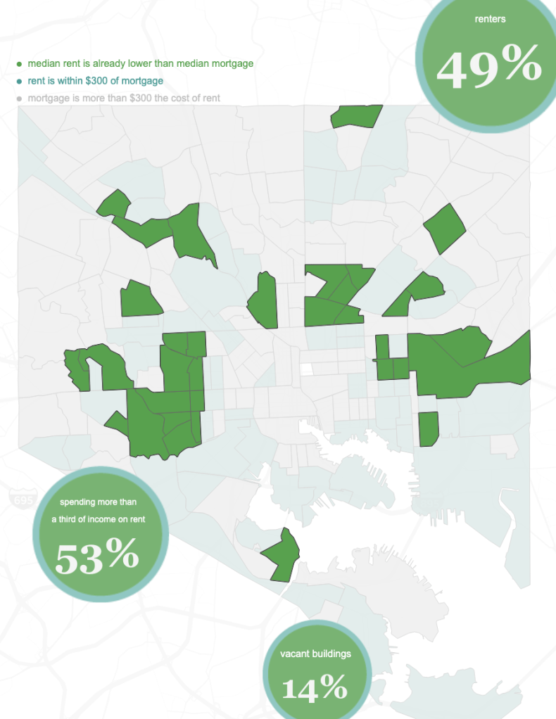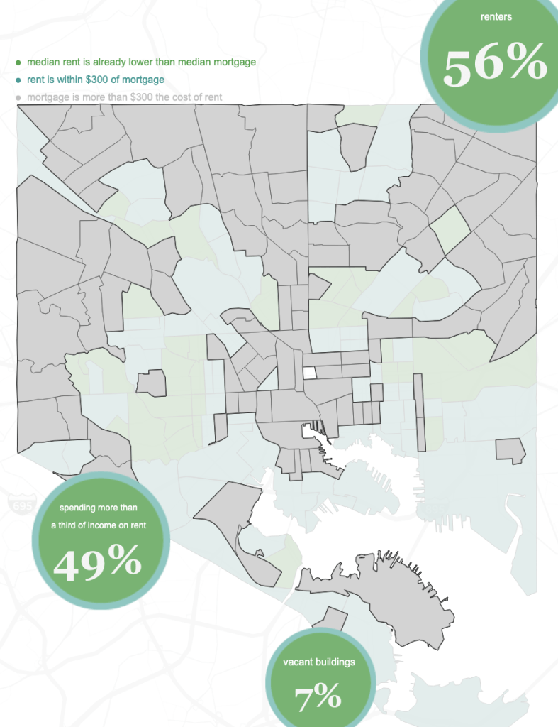 We know that homeownership is a path toward stability and building wealth, so how can we provide renters with concrete ways to think about owning? How can we connect renters with innovative resources that make the prospect of ownership more possible? How can we give current renters the confidence to pursue a path to homeownership? There is a LOT of information on the web, and a lot of information specific to Baltimore, especially given the city’s unique socioeconomic context and the impact of generational wealth disparity and institutional racism. If I were a renter–someone who was working full time, maybe with a child–I imagined I would have a hard time finding simple, accessible information that gave me a sense of possibility in one place. I wanted to fill that niche for renters in a specific geographic location: Baltimore City and its neighborhoods. My ultimate goal with this project would be to create individual print posters for display in community organizations–churches, cultural centers, advocacy organizations, and so on–focusing on specific CSAs, though it also has an interactive Tableau dashboard to facilitate online exploration.