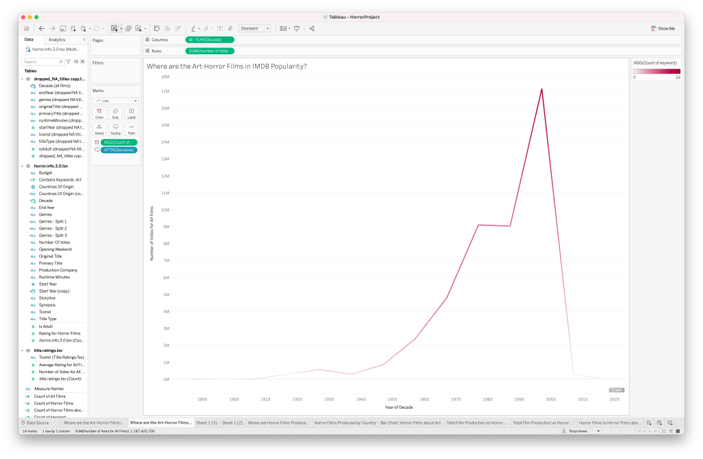 I then created a couple of simple line charts–the ones on the bottom use dual-axis to compare, in non-synchronized axes, total film production to horror film production. You can see that overall, horror films make up a small percentage of the total overall films. What does this look like in terms of percentage? With a smaller axis range, we might be able to see something interesting. I created a calculated field that allowed me to see the proportion/percentage of horror films to all films, and you can see that there are peaks in the 1880s and 1980s–and that there’s a steady increase from the 1900s on up to the peak of the slasher period. My scraper kicked out at about 8000 rows, and IMDB data is (in general) chronological. But, from an earlier exploration of IMDB data, it was very clear that around 2019 film production dropped off dramatically (I wonder why???). So, we’ll just have to wait and see what more complete data shows.