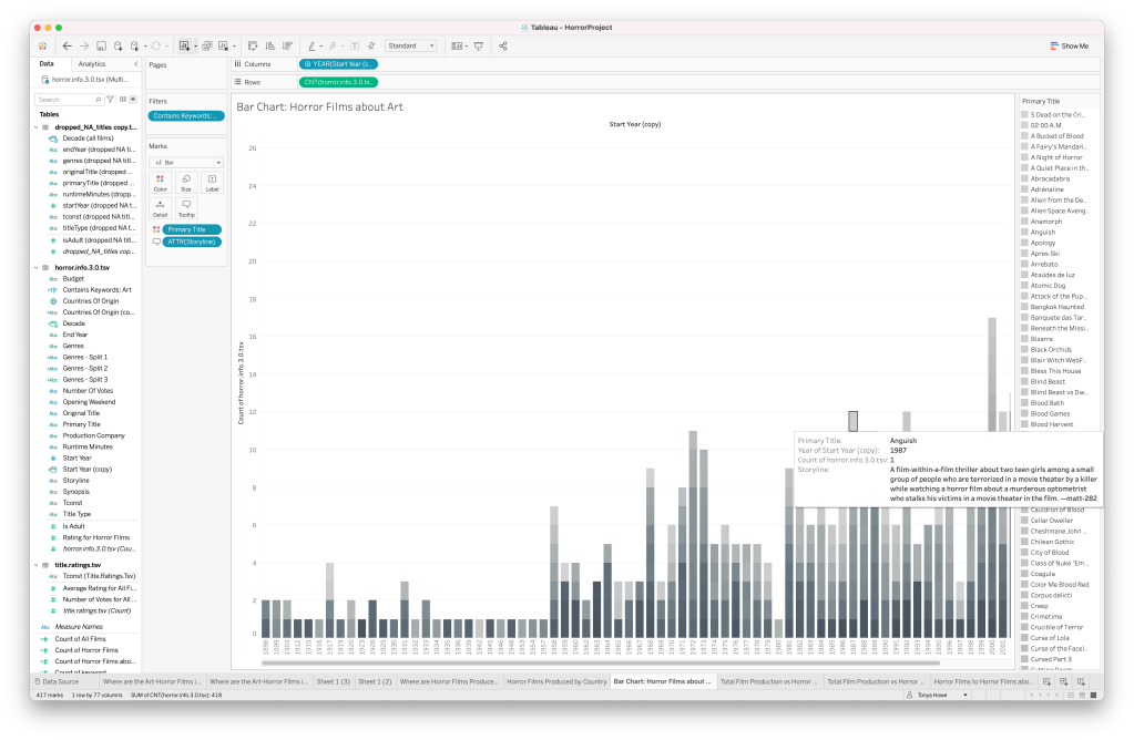 Also curious about the number of art-horror films, I created a calculated field (thanks, Google!) using the CONTAINS function to search the Storyline text dimension for relevant keywords. I can add more to this list as I go on, but this gets me started: