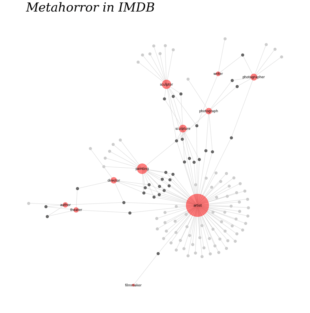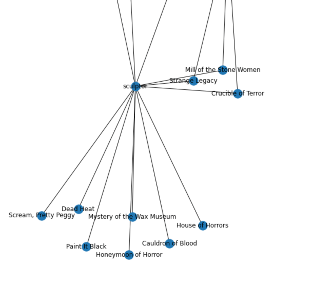 This looks pretty good! What you see here is the edge (connecting lines) between each node, where the nodes are the unique data in the edgelist. In the detail below, you’ll see, for instance, that the node “scupltor” is indistinguishable from the nodes “Scream, Pretty Peggy,” “Mill of the Stone Women,” or “Cauldron of Blood,” which are film titles. How to distinguish them? Why is this happening?