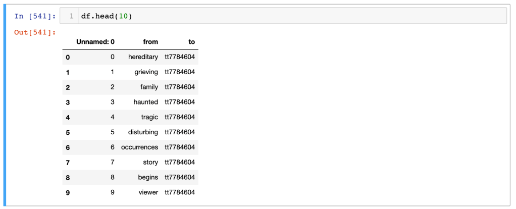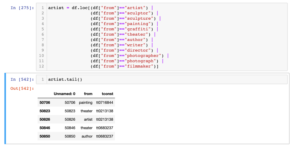 After playing with merging other datasets, renaming columns, dropping unnecessary columns, and so on, I realised that I needed to simplify. I ended up with a dataframe called “artist_edges_titles_ratings” with, in addition to a bunch of other info I didn’t use, contaiined two columns titled “from” and “primaryTitle.”