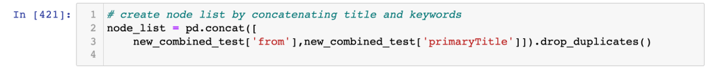 Wait, what exactly is a node list vs an edge list? A node list is basically a list (and it should be a list, which I’ll explore below) of all the unique pieces of information–so, all the keywords and the film titles need to be in a single list. That way, I could then indicate which were keywords and which were film titles. I was sort of expecting pandas or networkx to just make those distinctions, which they can’t do. So, I concatenated the title list and the source list (which in the original dataframe holds the keywords. This gave me a dataframe called node_list