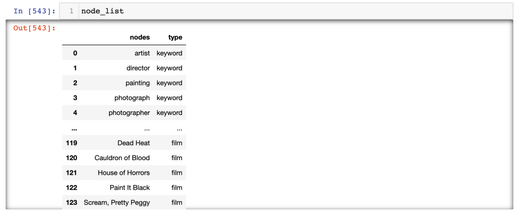 This gave me a dataframe with an index (note, I had to use node_list.reset_index(inplace = True) to re-number the index consecutively) and a single column, and in that column, a list of all the unique data points in my dataset. I needed to add another column for the type attribute–this allowed me to distinguish between keywords and films. I sort of brute-forced this, but since I am looking at a small number of keywords, that wasn’t such a bad thing.
