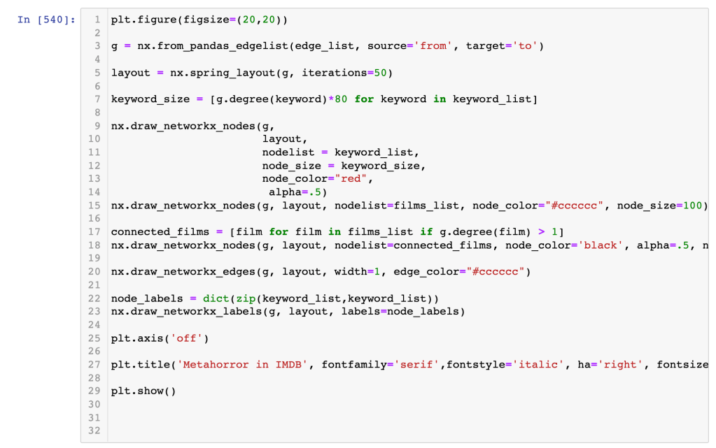 I spent the last few days trying to figure out parts of networkx, a python package for network diagramming–with some success! I had some old data from an earlier attempt at using networkx with tokened text from IMDB summaries and synopses. That code basically took each text chunk, tokened it out, dropped stopwords, and then created an edge list with individual words in the summary/synopsis as the source and ttconst as the target, like so: