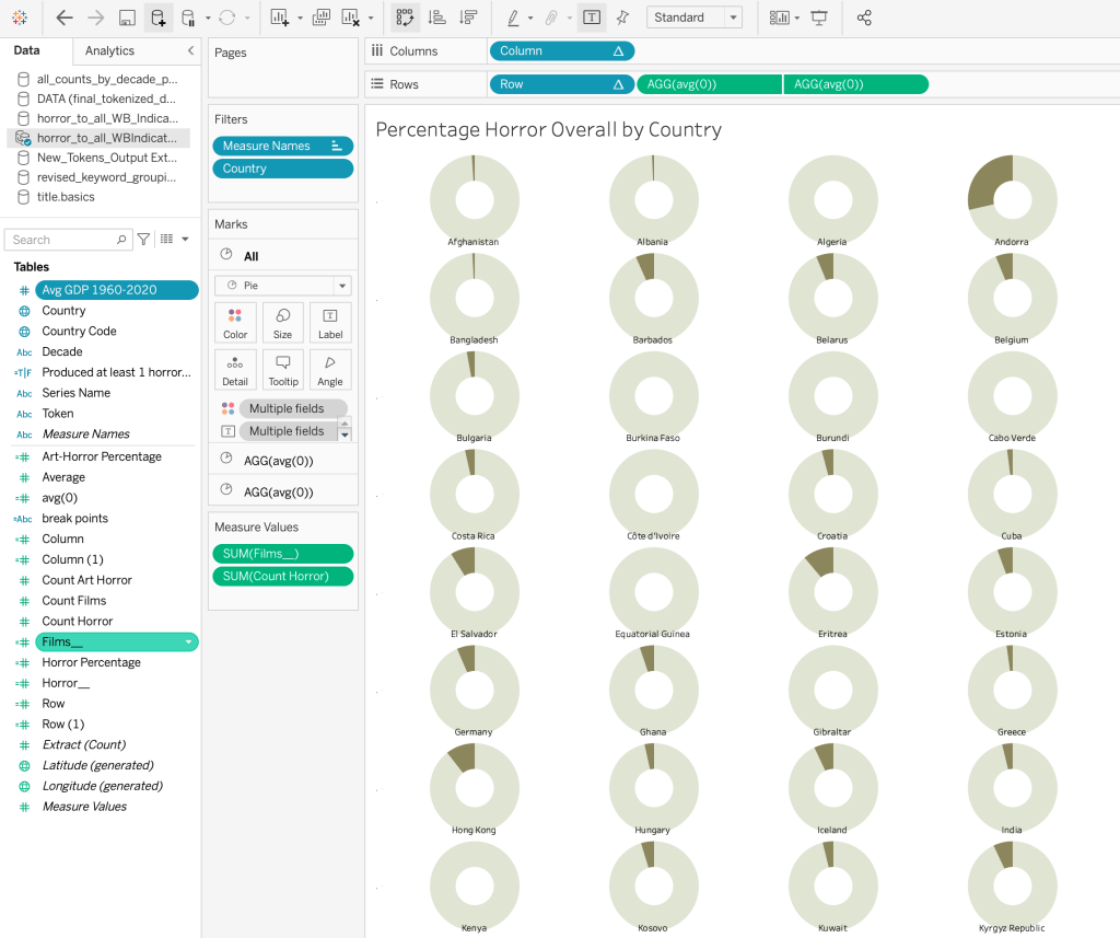 I was having a lot of problems at first with my proportions just not looking correct. Obviously, you need to include the items you’re comparing in your donuts, but because some countries in my dataset didn’t have film industries at all, or no horror films, or no horror films about art, those observations came in as nulls. So (thanks, Louis!), I needed to use the ZN function to replace nulls with zeroes, and then get an accurate number of the total films.
