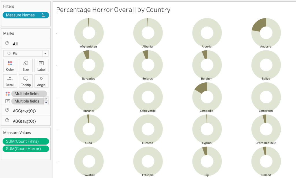 Without this calculated field, all of the proportions were off–a country that had clearly more than 25% of its films in the horror genre didn’t look like over a quarter were in that category. I think the data was getting shifted over to fill in the nulls with adjacent data (but totally not sure of this–if you know why, let me know!). This is what the donuts looked like with just the raw Count of all Films in place of the ZN calculation–note that Andorra’s 29% registers as below a quarter–that’s what tipped me off!