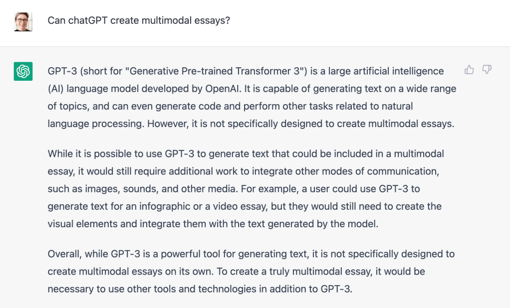 As the nature of literacy changes, as the kinds of information we have access to changes, and as the medium that is our message changes, we need to respond in kind. So perhaps we can take a page from this ChatGPT essay on the multimodal essay: