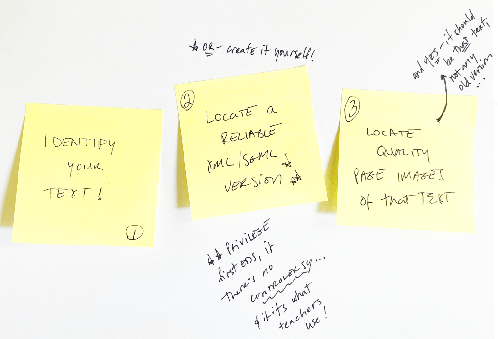 Essentially, the basic workflow is 1.) Figure out which text you’re working with, 2.) find a good XML version of it (or create your own!), 3.) find quality page images, preferably in full color (or create them yourself from a physical copy in a nearby library), 4.) get the XML into our flavor of TEI, 5.) add the LiC teiHeader, 6.) correct and proofread, 7.) add your details so you can be named as a contributor, and 7.) most importantly, celebrate!