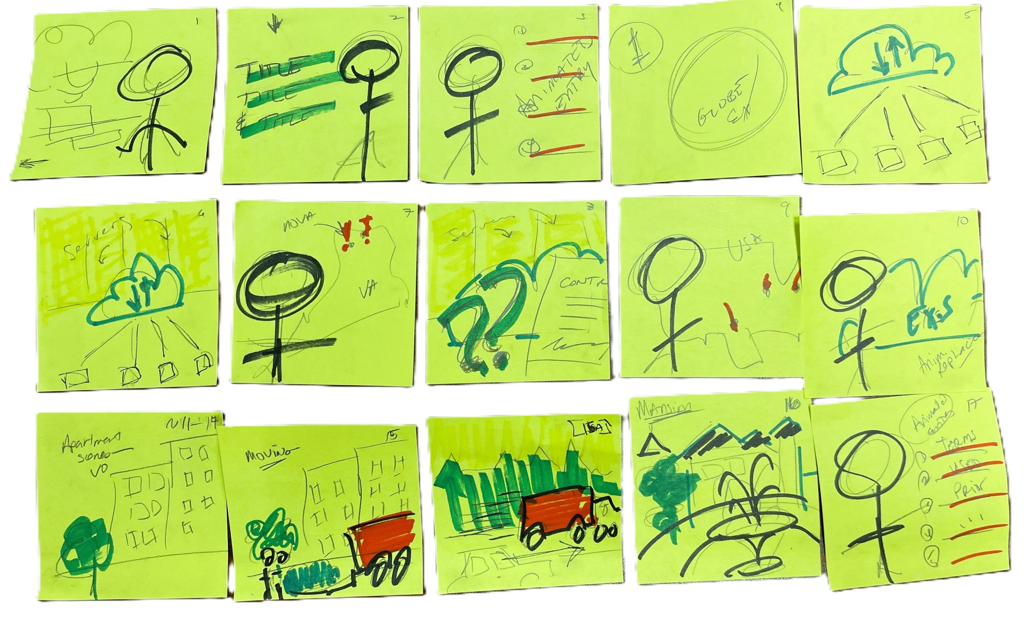 I used Post-Its to block out the first six pages of the lecture into about 15 scenes. Some of the scenes I chose not to include in the storyboard, because I knew they existed in Vyond and could easily be dropped in with an accompanying voiceover. It’s important to remember that you don’t have to be a great artist when you’re storyboarding! Stick figures are totally cool, as anyone who reads XKCD knows.